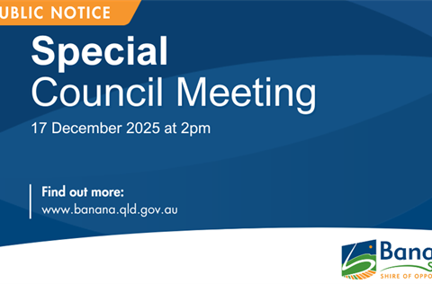 Banana Shire Council Special Meeting Published on 11 December 2025 Banana Shire Council Special Meeting will be held on Wednesday, 17 December 2025 at 2:00 pm at the Council Chambers, 62 Valentine Plains Road. Tagged as: , Public Notices