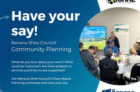 Have your say: Banana Shire launches Place-Based Planning workshops Published on 29 September 2025 Banana Shire locals will have the opportunity to tell Council what they value, what needs improving and which legacy projects they would like prioritised for their community through a series of Place-Based Planning workshops held across the next month. Tagged as: , Media Releases