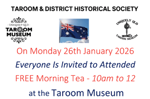 Australia Day 2026 Taroom & District Historical Society 26 Jan 2026 Everyone is invited to attend free morning tea 10am to 12pm, Monday 26 January 2026 at the Taroom Museum. Taroom Museum, 17 Kelman Street, Taroom 4420 Tagged as: , Community events & fundraisers